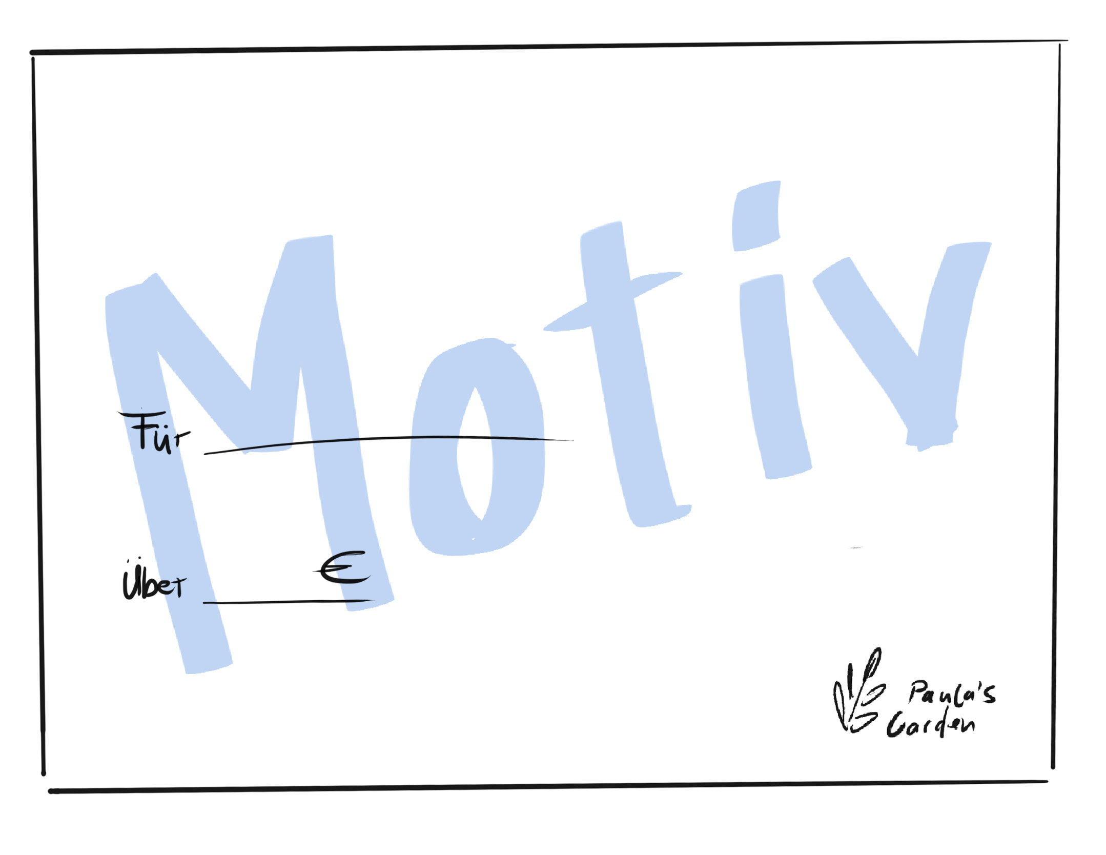 Wähle eins der Motive sowie deinen Wunschbetrag aus. Schreibe den Namen des beschenkten Menschen in die Eingabemaske. Dein Gutschein wird durch deine Bestellung direkt hier in Paula’s Garden ausgedruckt. Du kannst ihn sofort bezahlen und mitnehmen!